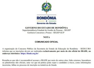Nota oficial alerta candidatos do concurso da Seduc RO sobre inscrições