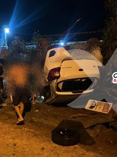 De acordo com informações colhidas no local, o condutor seguia pela via quando perdeu o controle da direção. O impacto foi tão forte que o carro tombou na pista e colidiu contra o muro frontal de um imóvel, causando danos materiais significativos à propriedade. No interior do veículo, além do motorista, estavam duas crianças.