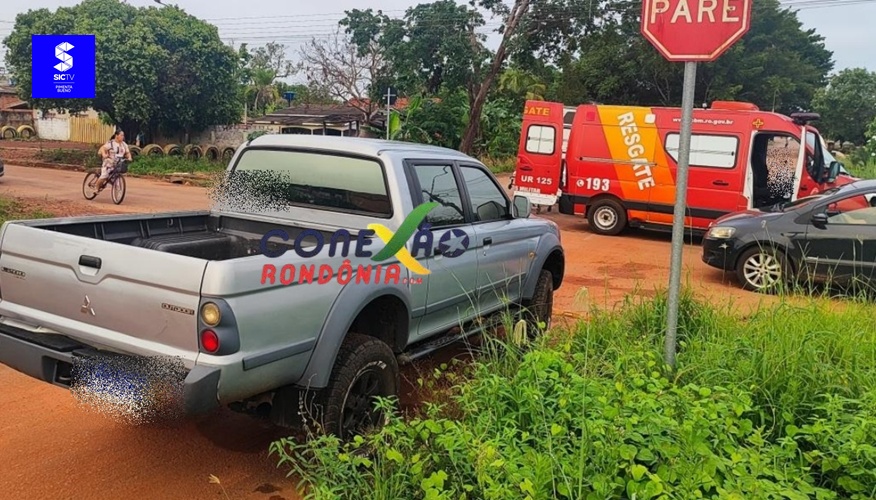 Uma mulher ficou ferida após um acidente ocorrido na manhã de quarta-feira, 15 de outubro de 2025, no cruzamento da Avenida Guararapes com a Rua José de Alencar, em Pimenta Bueno.