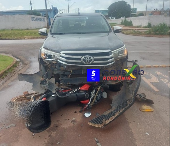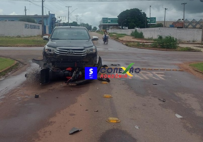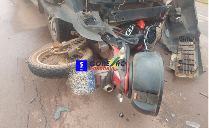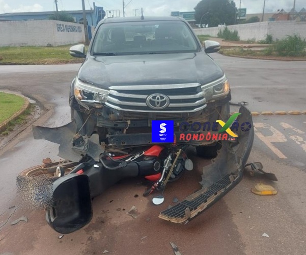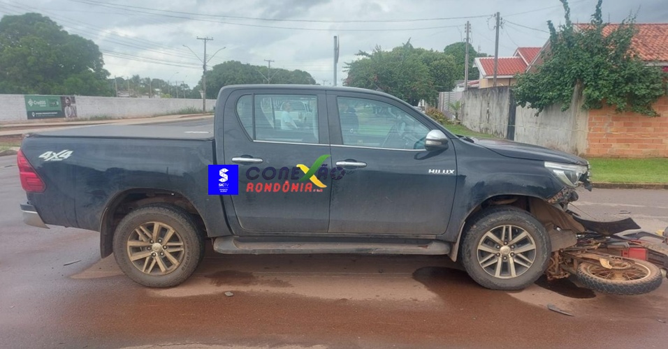 Um acidente de trânsito envolvendo uma caminhonete e uma motocicleta foi registrado na manhã do último sábado (20), no cruzamento da Avenida dos Expedicionários com a Rua Petrônio Portela, em Pimenta Bueno (RO).