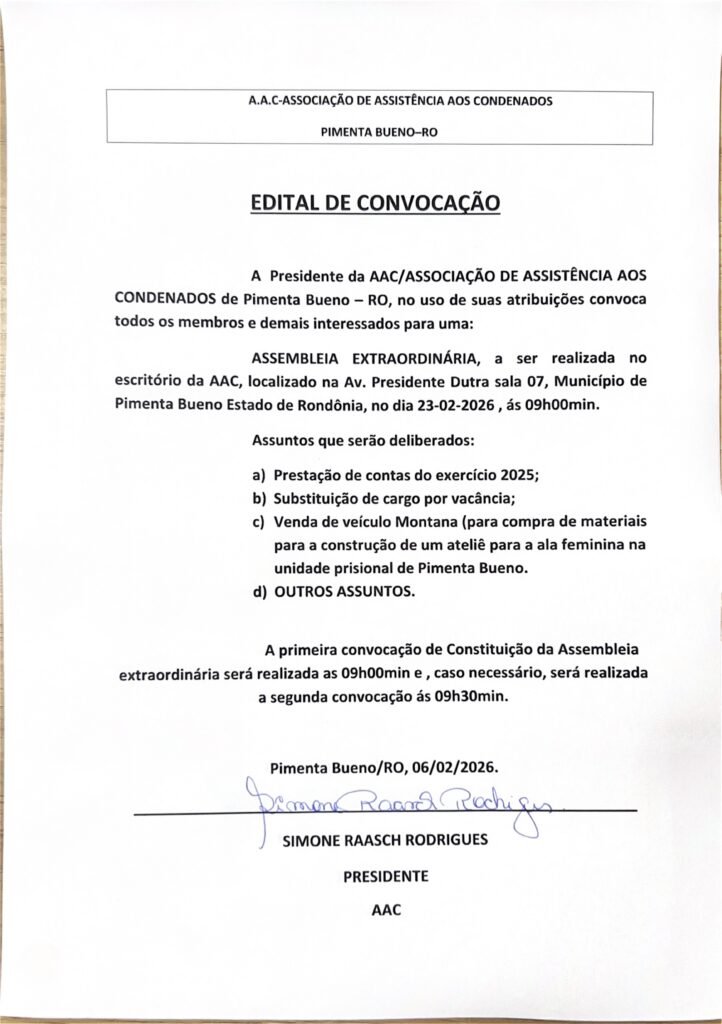 EDITAL DE CONVOCAÇÃO – AAC/ASSOCIAÇÃO DE ASSISTÊNCIA AOS  CONDENADOS DE PIMENTA BUENO – RO