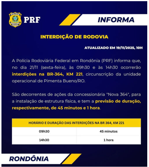 A Polícia Rodoviária Federal (PRF) em Rondônia divulgou um comunicado informando que duas interdições temporárias serão realizadas nesta sexta-feira, 21 de novembro, na BR-364, KM 221, trecho sob responsabilidade da unidade operacional de Pimenta Bueno.