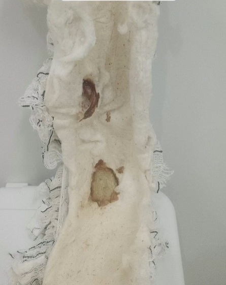 De acordo com os relatos, uma tala utilizada no braço do paciente teria permanecido por tempo excessivo, ocasionando o surgimento de uma ferida crônica. A lesão apresenta sinais preocupantes, com suspeita de infecção generalizada, o que levanta o risco real de amputação do membro afetado.