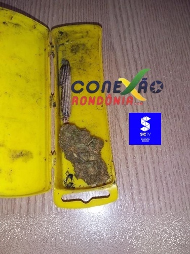 Durante a busca pessoal, os policiais encontraram um estojo de cor amarela contendo uma pequena porção de substância entorpecente do tipo maconha, além de um cigarro parcialmente consumido e um dichavador com vestígios do mesmo material.