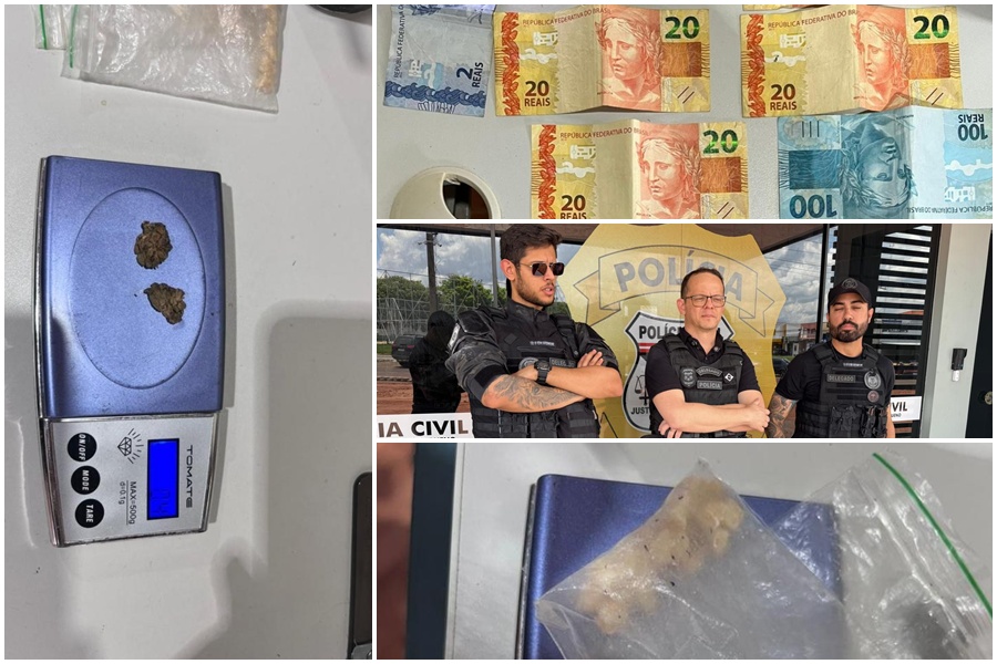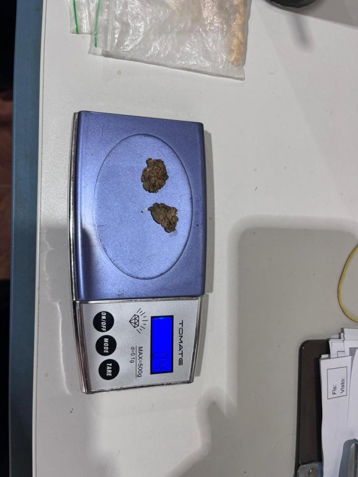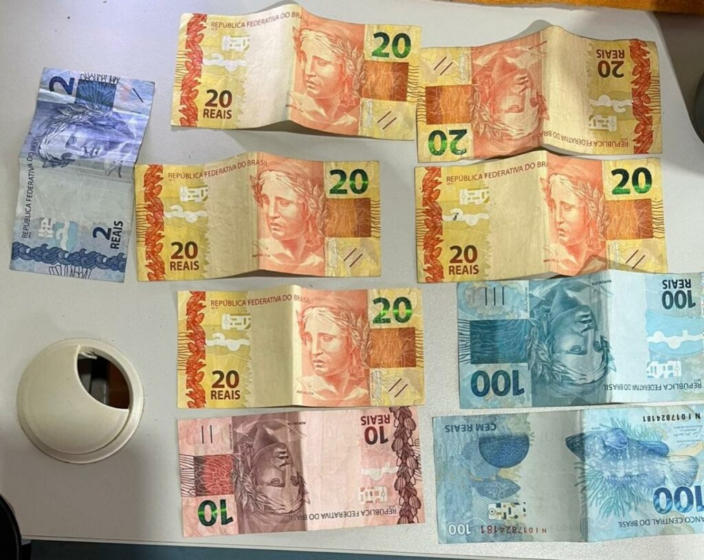 Durante a revista, foram encontradas porções de substâncias entorpecentes, aparelhos celulares e dinheiro em espécie, os quais foram apreendidos para investigação.
