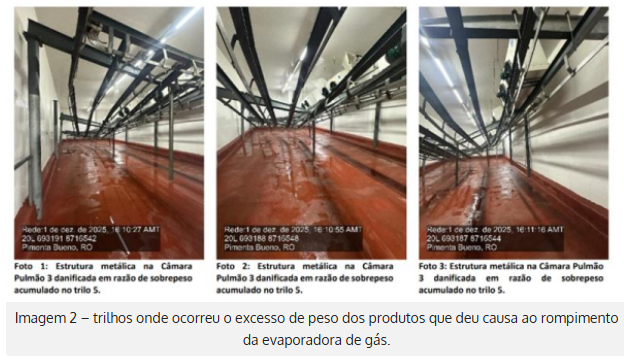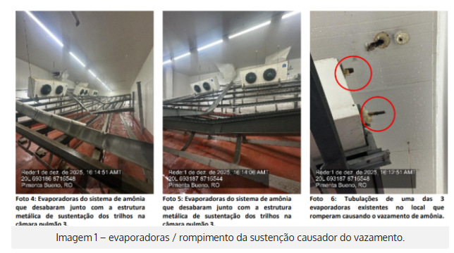 A Perícia Judicial realizada pela Justiça do Trabalho concluiu que o vazamento de gás amônia ocorrido na Câmara Pulmão 3 da unidade frigorífica da JBS S.A., em Pimenta Bueno, foi provocado pelo desabamento da estrutura metálica responsável por sustentar os evaporadores do sistema de refrigeração.