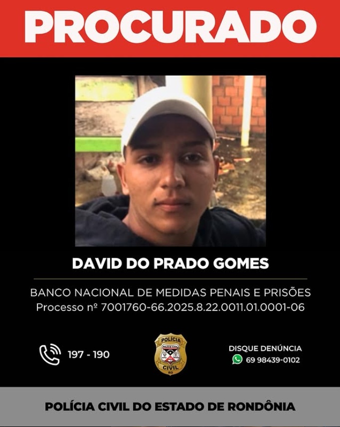 A Polícia Civil de Rondônia divulgou, na última quarta-feira (08), que David do Prado Gomes está sendo procurado pela Justiça. Ele é suspeito de envolvimento em crimes de extorsão, perseguição e descumprimento de medidas protetivas de urgência.