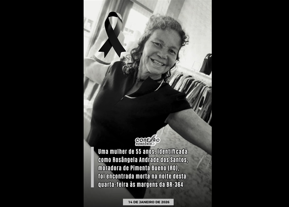 Uma mulher de 55 anos, identificada como Rosângela Andrade dos Santos, moradora de Pimenta Bueno (RO), foi encontrada morta na noite desta quarta-feira às margens da BR-364.