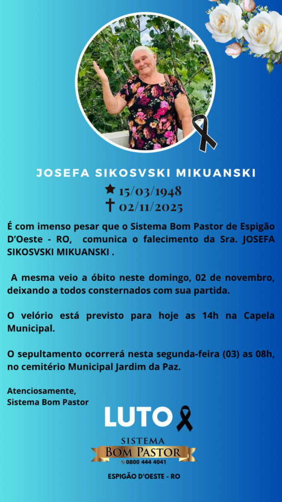 Sistema Bom Pastor em Espigão do Oeste emite nota de pesar pelo falecimento da senhora Josefa Sikosvski Mikuanski