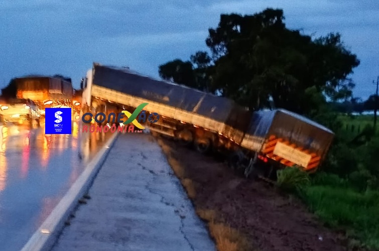 Uma carreta saiu da pista na noite desta segunda-feira, 1º de dezembro, nas proximidades do posto da Polícia Rodoviária Federal (PRF) em Pimenta Bueno. Apesar do susto, não houve registro de feridos.
