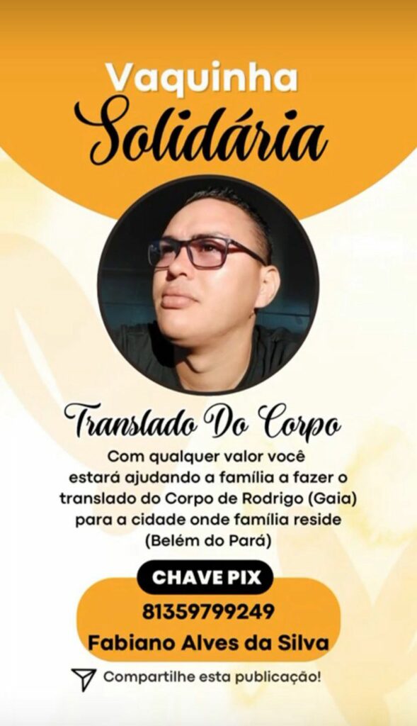 Toda a família de Rodrigo é de Belém do Pará e, neste momento de dor, pedem apoio para custear o translado do corpo.