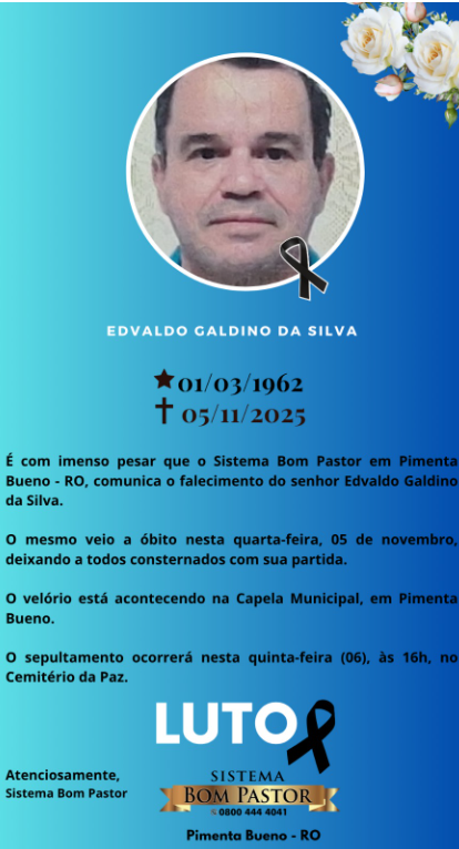 É com imenso pesar que o Sistema Bom Pastor em Pimenta Bueno – RO, comunica o falecimento do senhor Edvaldo Galdino da Silva.