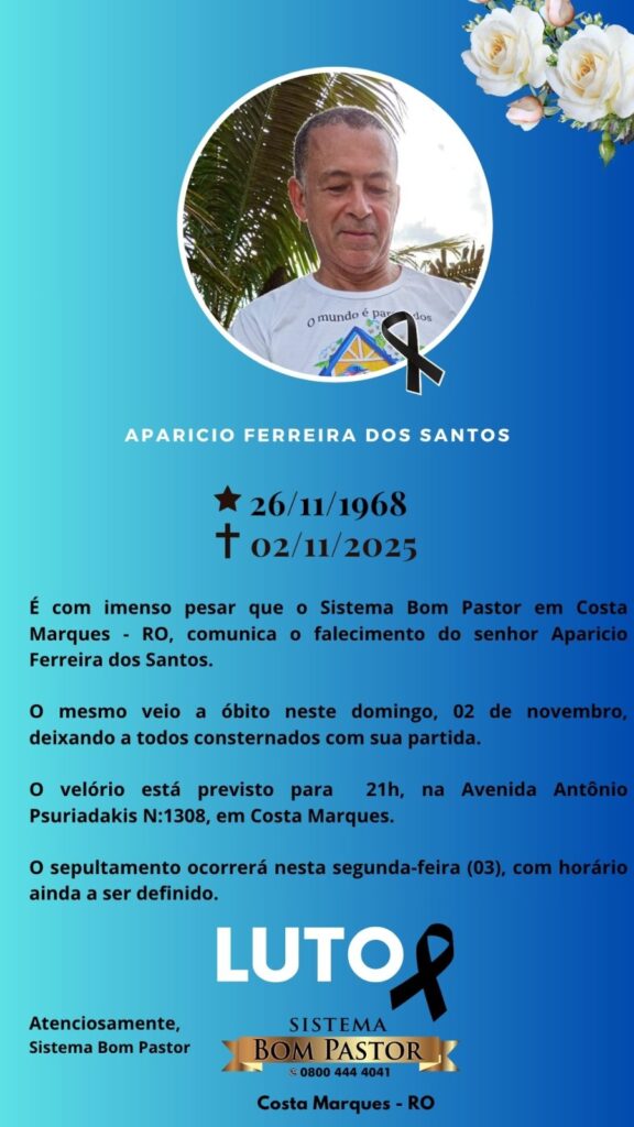 Sistema Bom Pastor em Costa Marques comunica o falecimento do senhor Aparicio Ferreira dos Santos