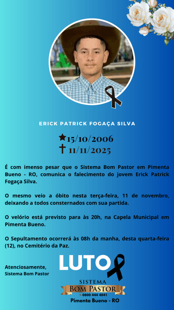 Sistema Bom Pastor em Pimenta Bueno emite nota de pesar pelo falecimento do jovem Erick Patrick Fogaça Silva