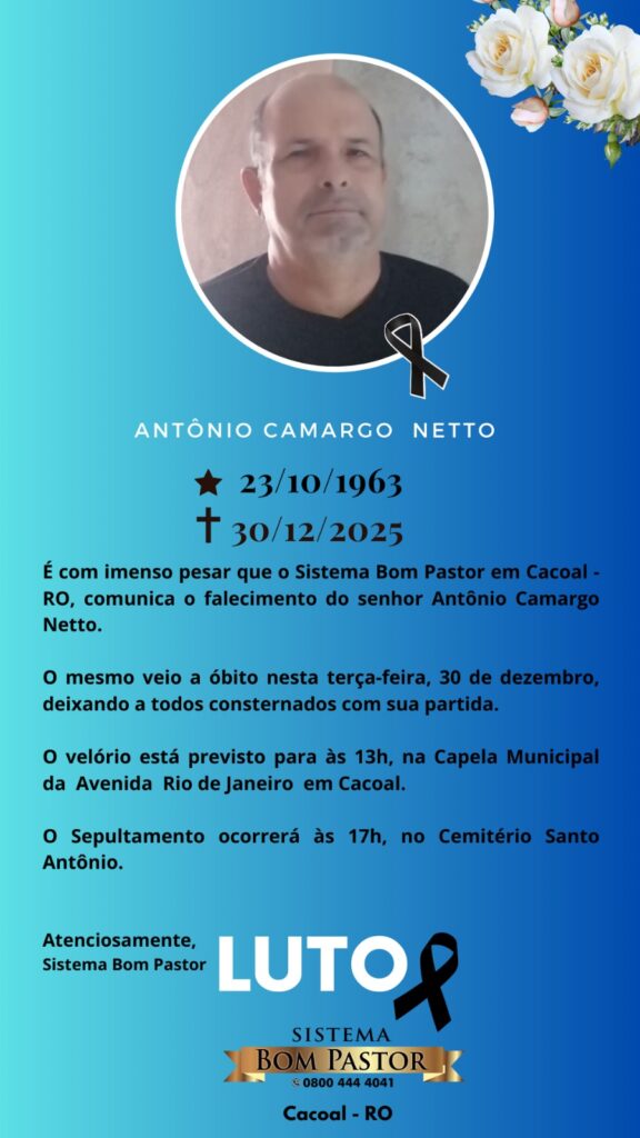 Sistema Bom Pastor em Pimenta Bueno emite nota de pesar pelo falecimento do senhor Antônio Camargo Netto
