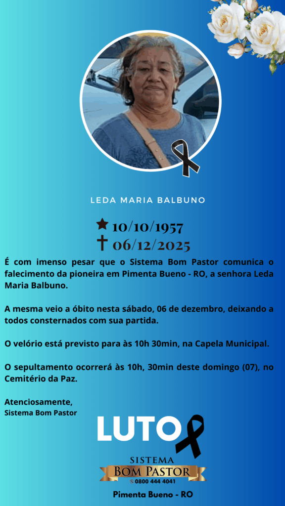 É com imenso pesar e profundo sentimento de consternação que o Sistema Bom Pastor comunica o falecimento da senhora Leda Maria Balbuno, uma verdadeira pioneira de Pimenta Bueno – RO.