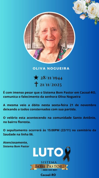 Sistema Bom Pastor emite nota de pesar pelo falecimento do senhora Oliva Nogueira