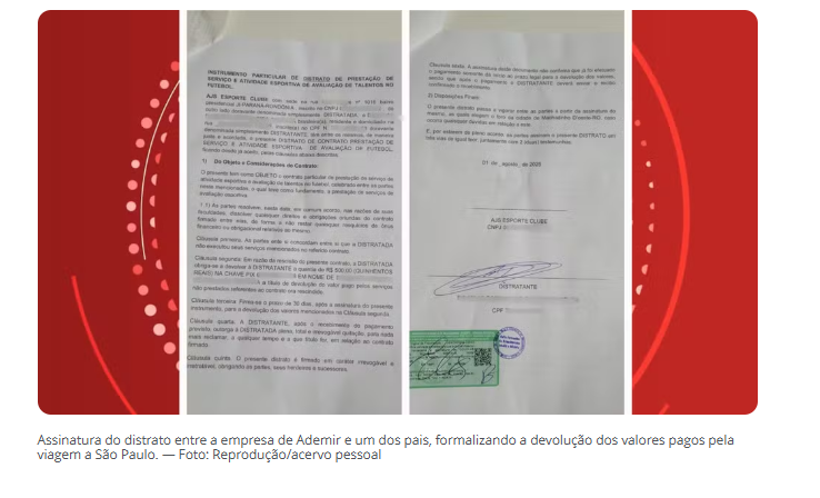 Diante dos contratempos, muitos pais decidiram cancelar o acordo e pedir o dinheiro de volta. Segundo eles, Ademir exigiu a assinatura de um novo contrato de distrato para devolver o dinheiro. Mas, mesmo após assinarem o documento, eles não tiveram o dinheiro de volta.